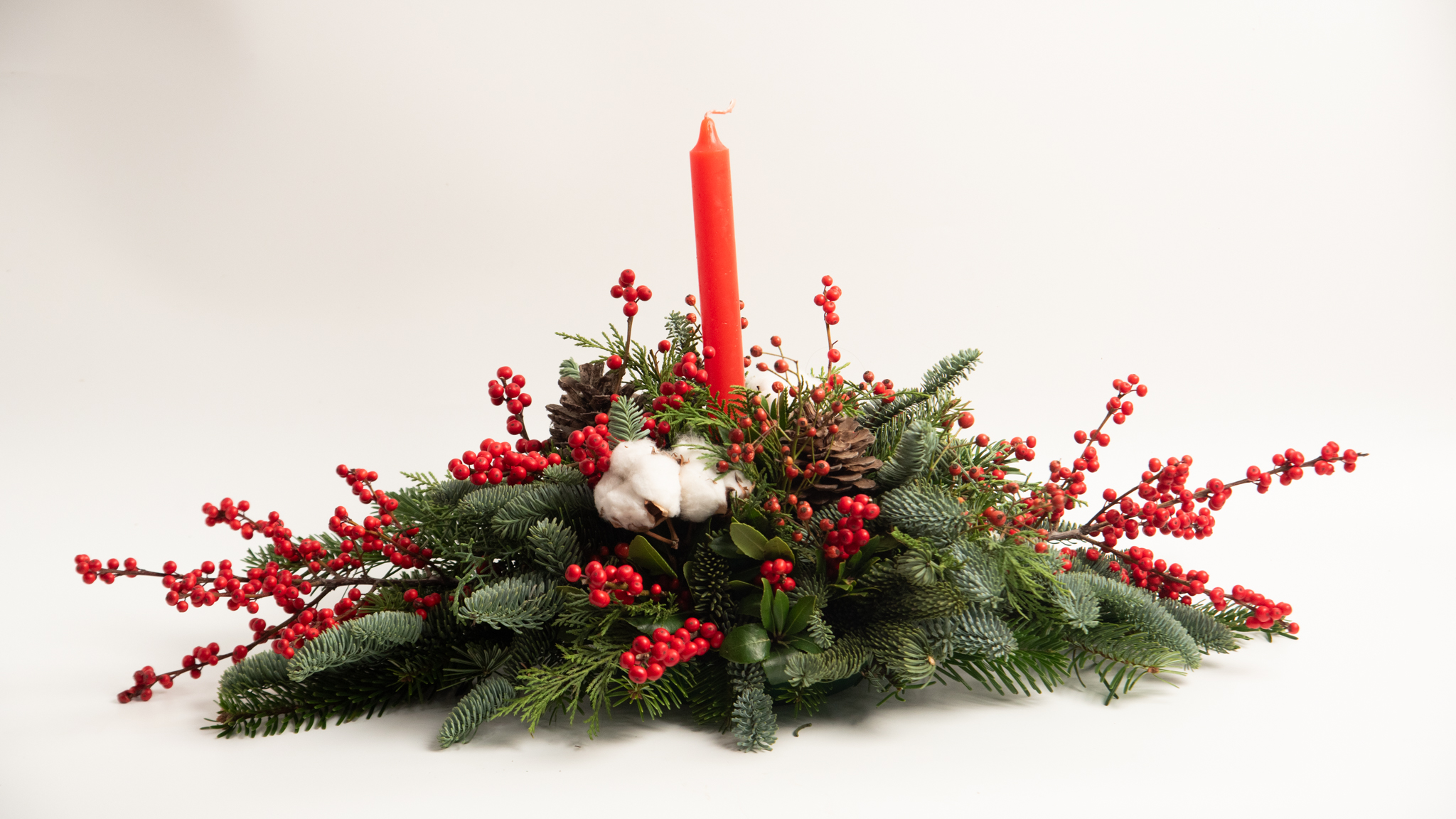 Υπέροχη σύνθεση από ίλεξ, βαμβάκι και καρπούς.