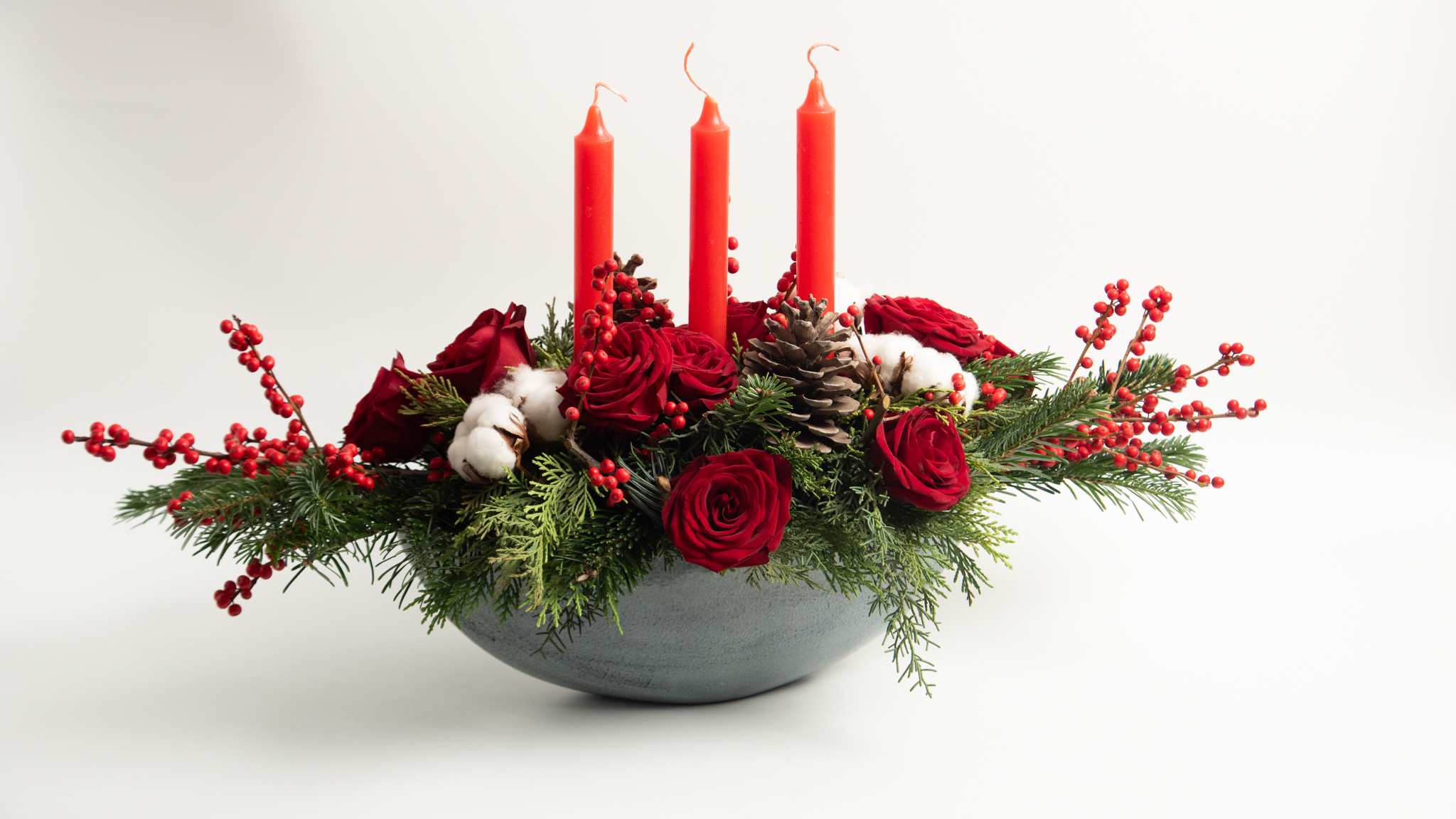 Μακρόστενη σύνθεση για το κέντρο του τραπεζιού με τρία διακοσμητικά κεριά, κουκουνάρια, τριαντάφυλλα, ίλεξ και χριστουγεννιάτικες πρασινάδες.