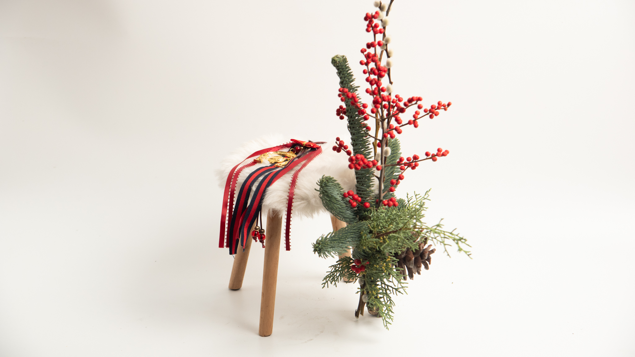 Διακοσμητικό σκαμνάκι διακοσμημένο με Χριστουγεννιάτικες πρασινάδες και γούρι
