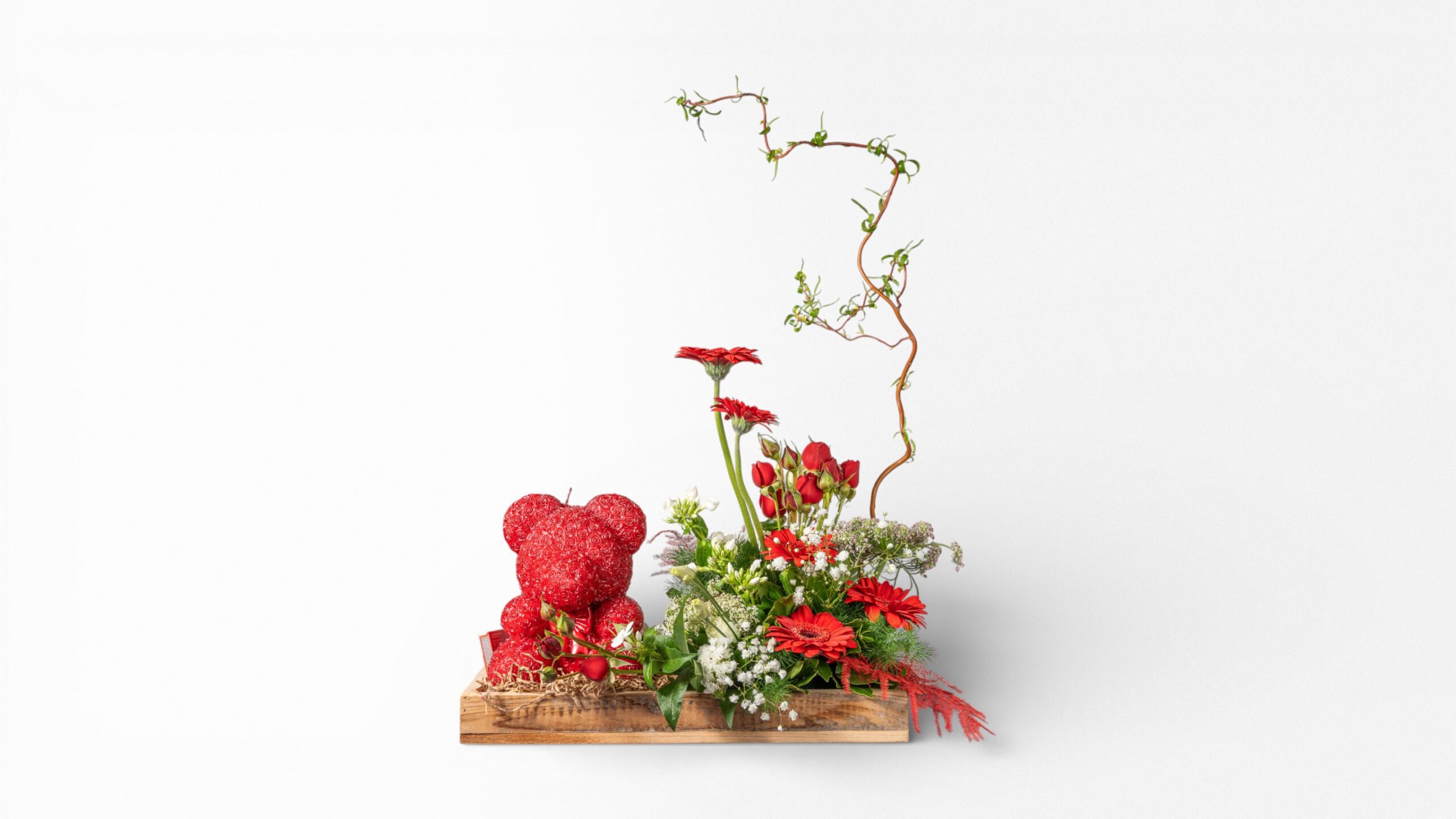 Σύνθεση λουλουδιών συνοδευόμενη με κέρινο αρκουδάκι σε ξύλινη βάση