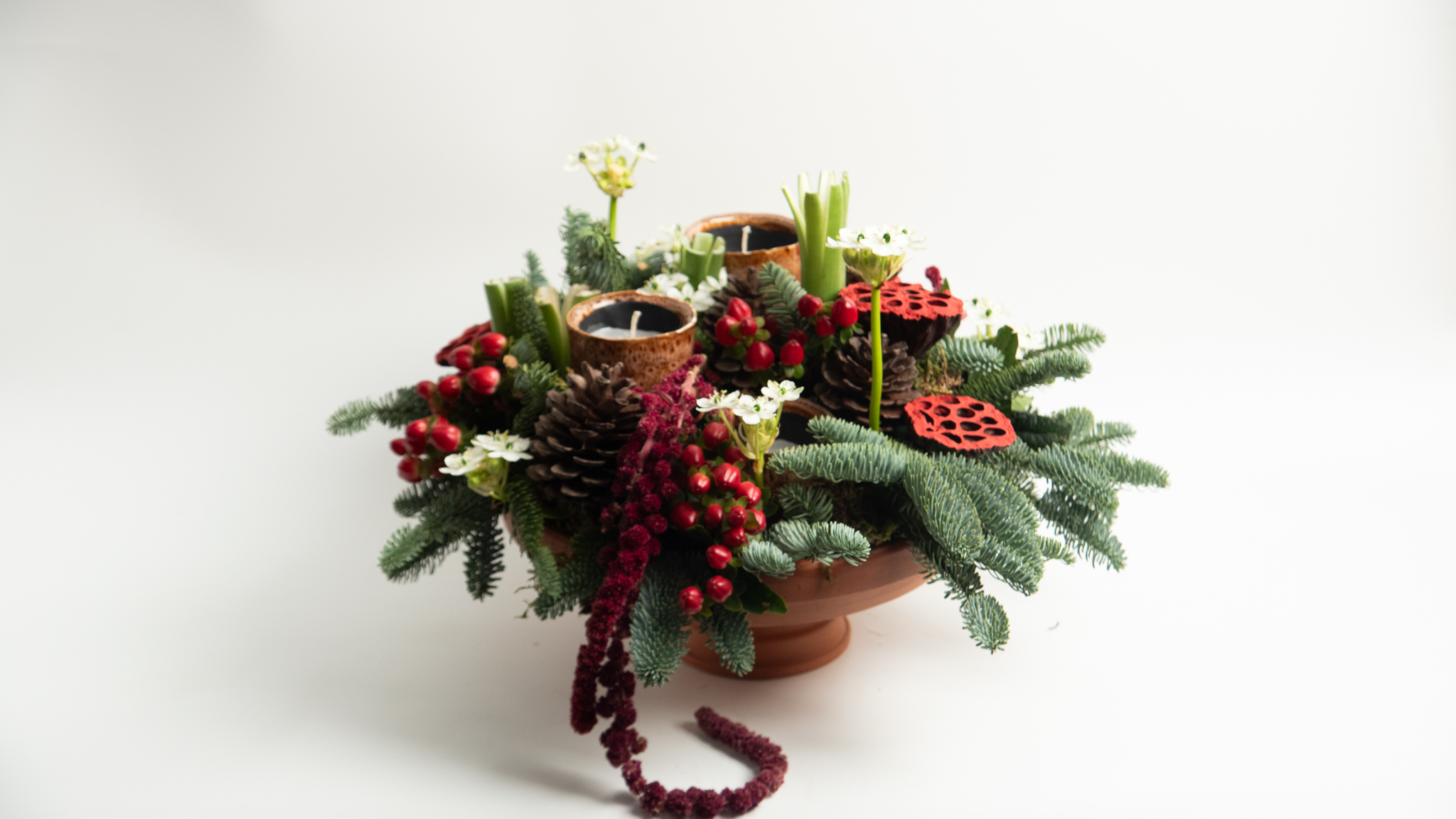 Χριστουγεννιάτικη σύνθεση σε κεραμική πιατέλα με κεριά σε κεραμικά κασπό