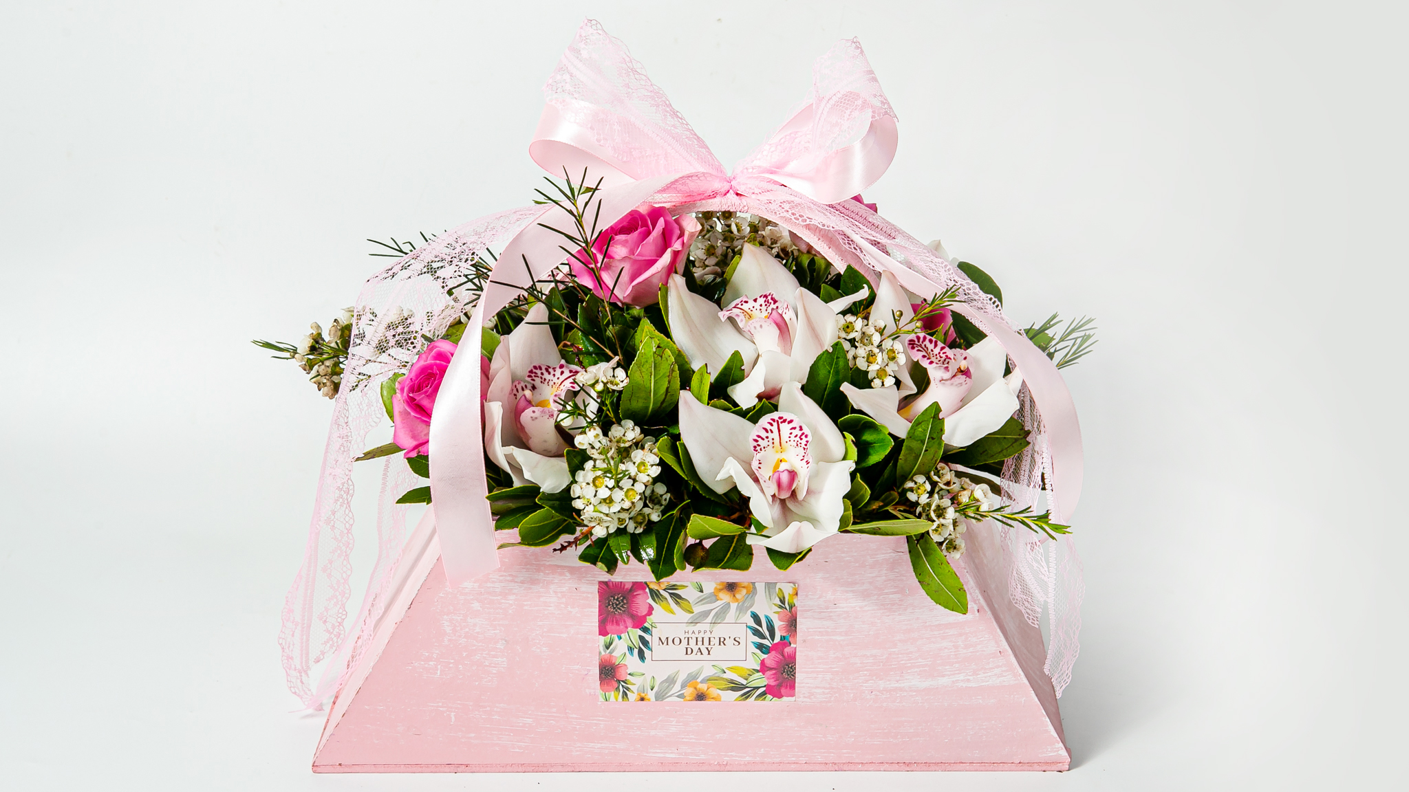 Σύνθεση λουλουδιών σε ξύλινο κασπό
