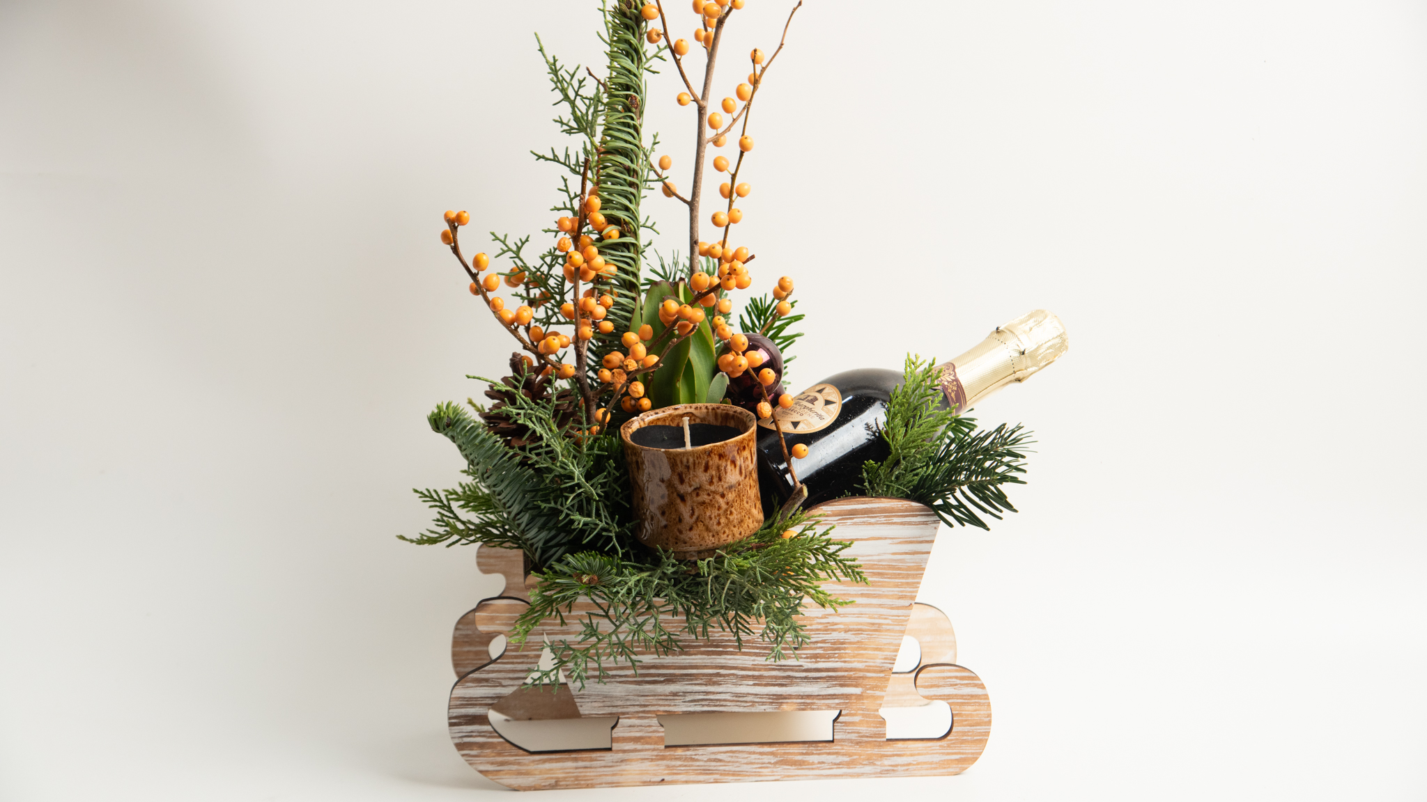 Ξύλινο έλκηθρο με Χριστουγεννιάτικη σύνθεση λουλουδιών, mini αφρώδη οίνο και κεράκι